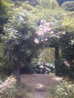 小道の奥に小さなバラの小屋。梁だけが木で、屋根も壁も一面バラが覆いつくしている。
